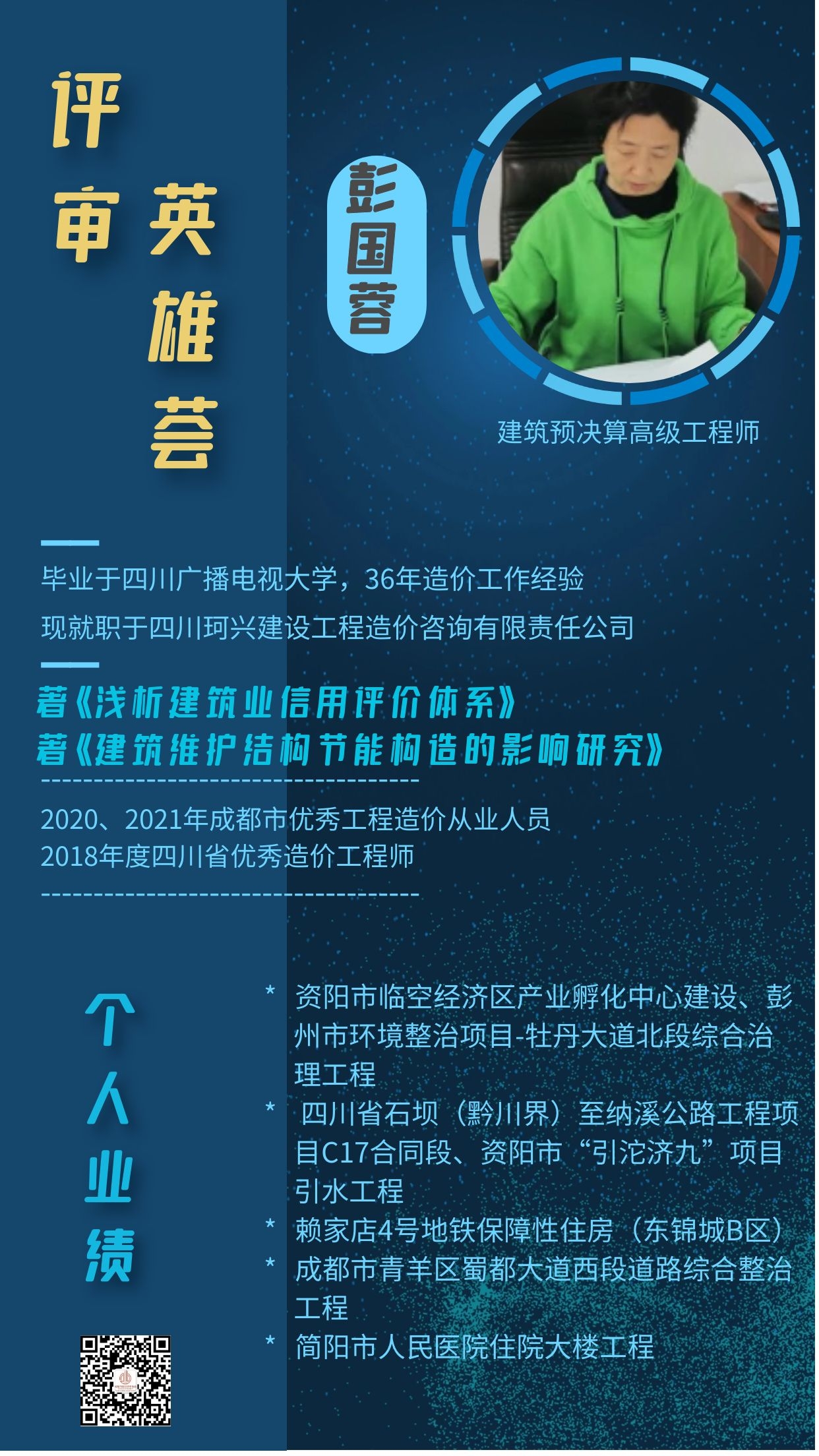 1、2019年该同志参与写作的论文《浅析建筑业信用评价体系》被评为成都市2019年度优秀工程造价学术论文三等奖。