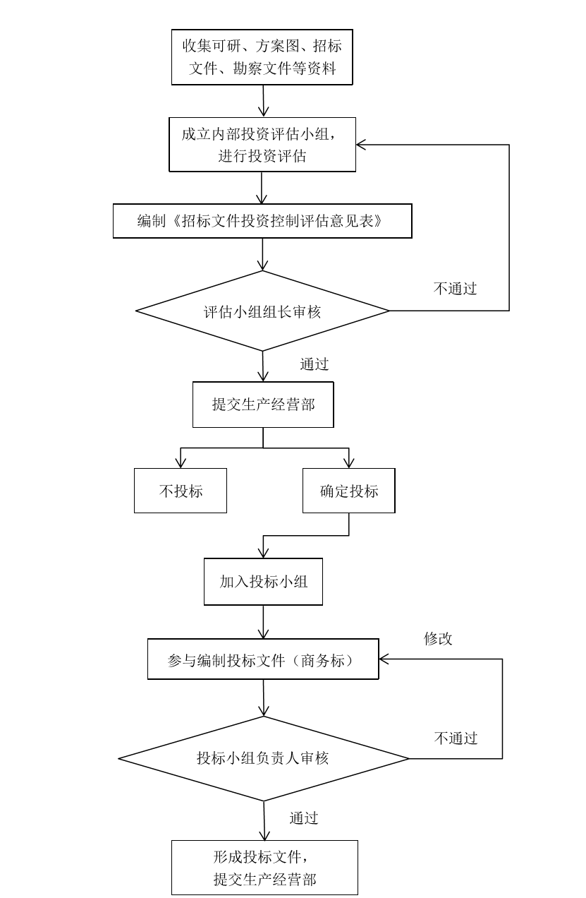 根据上表,商务人员或者生产经营人员应做到以下工作:(2)商务人员组成内部投资评估小组,如有需要可邀请其他部门专家参与;(3)对招标资料中的招标范围、风险费用约定、合同变更的计价方式、付款的条件、节点及比例等与投资控制相关的内容进行分析、评估;(4)检查上控价与招标范围、招标内容的一致性、费用的合理性;(5)评定是否投标。如公司层面决定投标,则配合标书制作人员编制投标文件。如果项目顺利中标,首先组建项目商务小组,小组根据初设阶段中标或施工图设计阶段中标,来分解合同额,形成每个专业工程的投资目标,即品牌、价格、档次标准等,以指导后续阶段的投资控制管理。